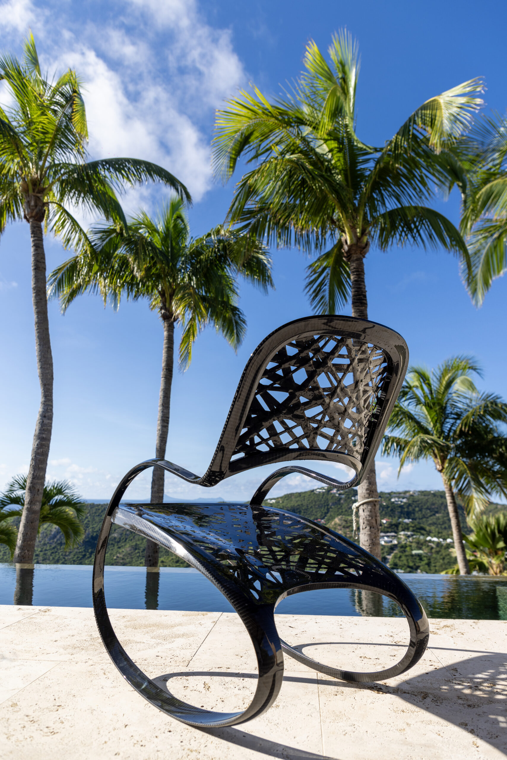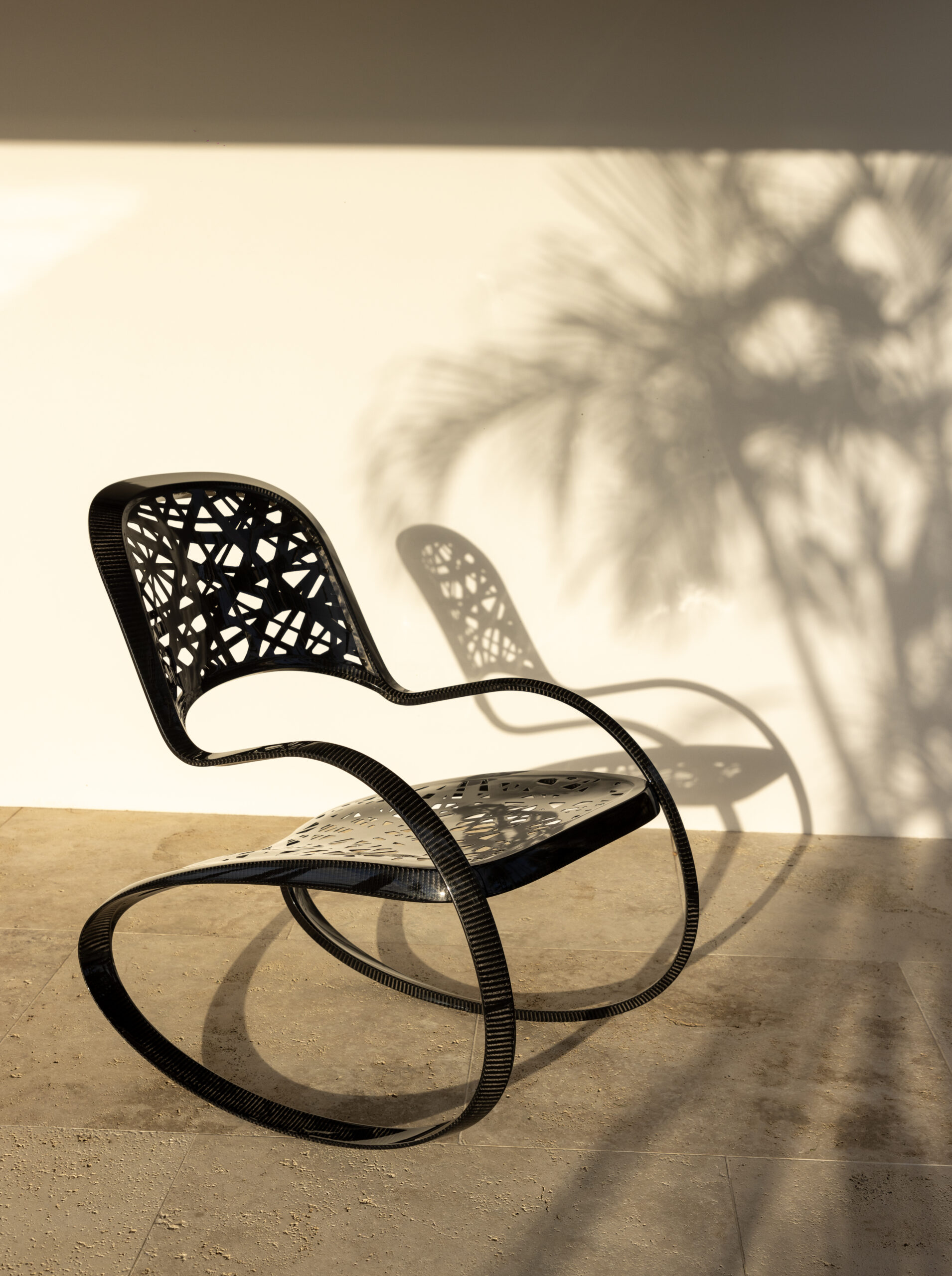 Rocking-chair (chaise à bascule) conçu en carbone creux monobloc, selon un procédé de fabrication française brevetée. La trame de l’assise et du dossier est également en fibre de carbone, réalisée selon une méthode de dépose de bandes de fibres placées sur un moule.